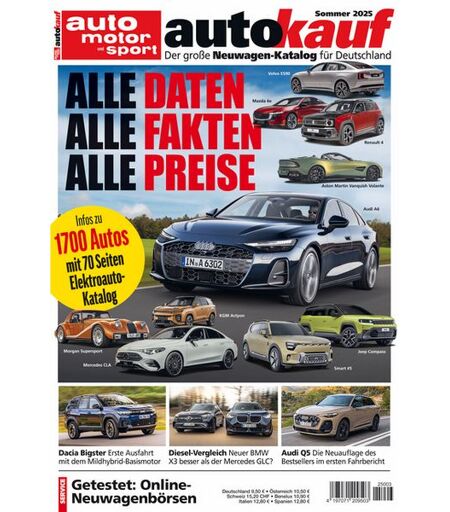 auto motor und sport AUTOKAUF ist ein vielseitiger und medienübergreifender Kaufratgeber für den deutschen Automarkt. Viermal pro Jahr Winter, Frühjahr, Sommer und Herbst liefert das Sonderheft alles Wissenswerte, wie bspw. Modellneuheiten, Fahrberichte, Tests und Service, rund um den Neuwagen. Hier finden Sie die komplette Marktübersicht mit allen aktuellen Modellen und Ausstattungsvarianten inklusive Preisangaben für Gebraucht- und Neuwagen. ...
