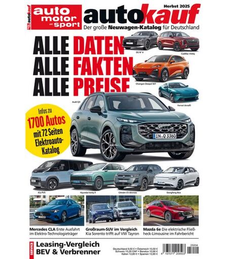 auto motor und sport AUTOKAUF ist ein vielseitiger und medienübergreifender Kaufratgeber für den deutschen Automarkt. Viermal pro Jahr Winter, Frühjahr, Sommer und Herbst liefert das Sonderheft alles Wissenswerte, wie bspw. Modellneuheiten, Fahrberichte, Tests und Service, rund um den Neuwagen. Hier finden Sie die komplette Marktübersicht mit allen aktuellen Modellen und Ausstattungsvarianten inklusive Preisangaben für Gebraucht- und Neuwagen. ...