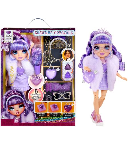 Die Heldinnen der Rainbow High - jetzt mit Kristall-Look! Jede Puppe der Serie Rainbow High Creative Crystals kommt mit einem speziellen Harz und passenden Formen zum Erstellen von tollen Kristall-Accessoires. Zusätzlich kann ein Kristallring für die eigene Hand hergestellt werden. Außerdem mit dabei: Ein zauberhaftes Outfit und weitere Accessoires. Violet Willow zeigt sich mit lila Haaren und lila Kleid, Herz-Handtasche und ausdrucksstarker Brille. ...