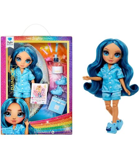 Träume in Blau mit der Rainbow High Junior High PJ Party - Skyler! Zum ersten Mal laden die Freundinnen der Rainbow High Junior High zu einer magischen Pyjama-Party ein. Skyler ist mit ihrem zweiteiligen Satin-Pyama-Set und passenden blauen Bärenpantoffeln perfekt für eine Nacht voller Geschichten und Spaß gekleidet. Ihre bezaubernd jugendliche Gesichtsform, das glatte, lange blaue Haar, lange Wimpern und gläserne Augen machen Skyler zu einem echten Hingucker. Mit dieser 23 cm großen Modepuppe entfalten Kinder ihre Kreativität und erschaffen beim Spielen immer neue, fantasievolle Geschichten. Bella und ihre Accessoires sorgen für jede Menge Spielspaß und zuckersüße Träume! ...