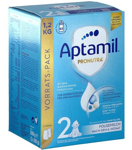 Anwendungsgebiet von Aptamil Pronutra Folgenahrung 2 Vorratspack ab dem 6. MonatAptamil Pronutra Folgenahrung 2 Vorratspack ab dem 6. Monat zur Ernährung von Säuglingen nach dem 6. Monat im Anschluss an das Stillen oder an eine Anfangsnahrung als Bestandteil einer gemischten Ernährung.