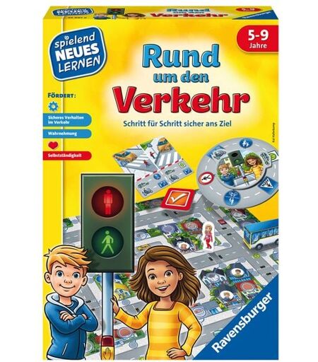 Wer hilft Leon und Mia, sicher ans Ziel zu kommen? Hier lernen Kinder verschiedenste Verkehrs-Situationen kennen und versuchen sie einzuschätzen: Wer verhält sich richtig? Mit der cleveren Ampelscheibe kontrollieren sie selbst ihre Antworten und gewinnen an Selbstständigkeit.Verkehrsspiele für Kinder bieten die Möglichkeit, das Verhalten im Straßenverkehr spielerisch einzuüben - in dem sicheren Rahmen, den ein Verkehrsspielzeug bietet.Inhalt: 1 Spielplan, 4 Spielfiguren, 19 doppelseitige Verkehrskarten mit 38 Situationen, 12 Ziel-Chips, 4 Tipp-Chips, 1 Ampelscheibe, 1 Würfel, 1 Bus, 4 Busfahrkarten, 1 SpielanleitungIm Verkehrsspiel „Rund um den Verkehr“ Lernen Kinder Schritt für Schritt, sich im Verkehr richtig zu verhalten. Was muss ich auf dem Gehweg, an der Ampel oder am Zebrastreifen beachten? Die Situationen im Verkehr sind vielfältig und erfordern genaues Wahrnehmen. Genau dies wird in „Rund um den Verkehr“ geübt. Wer genau hinsieht und erkennt, welche Abbildung das richtige Verhalten zeigt, für den steht die Ampel auf Grün. ...