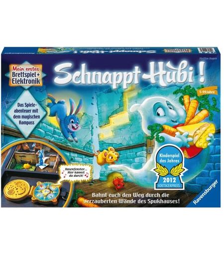 Schon wieder hat Hubi, das kleine Gespenst, heimlich Leckerbissen geklaut! Schaffen es nun die Hasen und Mäuse, Hubi im Spukhaus zu fangen? Die Spieler des elektronischen Brettspiels „Schnappt Hubi! bahnen sich den Weg durch die verzauberten Wände des Spukhauses. Doch die Wände sind tückisch: Mal kommen die Spielfiguren durch, springen darüber oder krabbeln durch ein Mauseloch . Mal müssen sie sich einen anderen Weg suchen. Doch auf den magischen (sprechenden!) Kompass ist Verlass, er sagt den Spielern immer, wie es weitergeht. Auch die Hausbewohner, wie Eule oder Fledermaus, sprechen mit den Spielern und geben jeweils einen guten Tipp, wo Hubi sein könnte. Durch die intelligente Elektronik verläuft jedes Spiel anders. Gewonnen ist das Spiel, sobald zwei Figuren Hubi in seinem Raum überraschen – so müssen die Spieler gut zusammenspielen, um das Gespenst Hubi zu schnappen! „Schnappt Hubi! wurde zum Kinderspiel des Jahres 2012 (Kritikerpreis) gewählt! ...