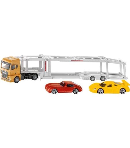 Funktionaler Autotransporter im Maßstab 1:50 mit MAN Zugmaschine und Auflieger der Marke Kässbohrer zum Transport von Fahrzeugen, Traktoren oder auch LKW, Inkl. 2 SIKU-PKW-Modellen - Robust und stabil dank Konstruktion aus Metall, Abkoppelbarer Auflieger mit Stützen, Komplett absenkbare obere Plattform zum Transport von SIKU-LKW und Traktoren im gleichen Maßstab - Langanhaltender Spielspaß durch unzählige Kombinationsmöglichkeiten innerhalb der SIKU Fahrzeugwelt, z. B. Zugmaschine auch mit anderen Anhängern kombinierbar - Ideal als Geschenk für Kinder zu Ostern, Geburtstagen oder für zwischendurch geeignet - Lieferumfang: 1x SIKU 3934 Autotransporter mit 2 SIKU-PKW-Modellen, Maßstab: 1:50, Material: Metall/Kunststoff, Abmessungen: 40,4 x 5,9 x 7,6 cm, Gewicht: 0,65 kg, Farbe: Gelb/Silber ...