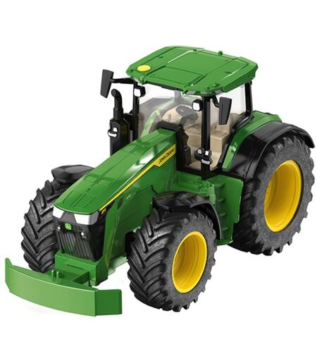 Massiver Traktor mit dem springenden Hirsch - Der John Deere 8R 370 ist ein Kraftpaket auf dem Feld und eine Zugmaschine für einen komfortablen Transport auf der Straße. Der Großtraktor überzeugt auch als 1:32-Modell mit zahlreichen Details. Nun lässt sich auch die Frontkupplung abnehmen und sehr einfach durch das mitgelieferte Frontgewicht ersetzen. Das bietet zusätzlich zu den Funktionen der Heckkupplung noch mehr Spielmöglichkeiten. Der Traktor lässt sich über das Lenkrad steuern, dazu kann die Kabine einfach abgenommen werden. Die Fronthaube kann geöffnet werden und gibt den Blick auf den mächtigen Sechszylinder frei. ...