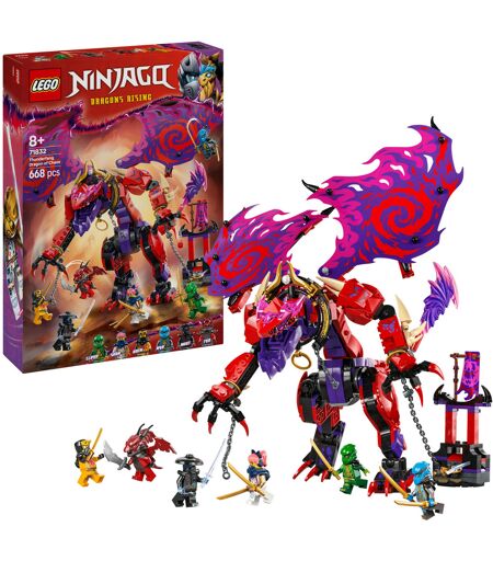 Mit diesem LEGO-Set aus der Welt von Ninjago werden die spannenden Abenteuer aus der 3. Staffel der Serie "Ninjago - Aufstieg der Drachen mit LEGO-Teilen lebendig. Aus 668 Teilen entsteht ein etwa 24 Zentimeter großer Spielzeugdrache, der Schwanz, Kopf und Maul sowie Füße, Beine und Flügel bewegen kann. Außerdem trägt er einen Shooter unter jedem Flügel. Der Drache ist an ein kleines Nebenmodell gekettet. Mit den beiden Prismaklingen kann man ihn von den Ketten befreien. Außerdem enthält dieses Set 6 Minifiguren: Die Ninja-Helden Lloyd, Nya, Arin und Sora tragen Ninja-Ausrüstung. Die beiden Bösewichte Nokt und der Anführer der Drachenmenschen namens Tyr sind ebenfalls bestens für spannende Duelle zwischen Gut und Böse ausgerüstet. ...