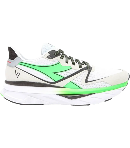 Nach mehr als 40 Jahren steht der Laufsport wieder ganz im Zeichen italienischer Qualität und Kompetenz. Technologische Innovation, handwerkliches Können und kreatives Design verschmelzen zu einem Schuh, der dazu bestimmt ist, Kultstatus zu erreichen. Der Atomo V7000 zeichnet sich durch optimale Dämpfung und Komfort aus - die herausragende Eigenschaften aller Diadora Running-Produkte - und ist zudem erstaunlich leicht und reaktionsfreudig, was durch den Einsatz einer neuen Technologie gewährleistet wird: der speziellen "dd-anima"-Mischung. Die neue dd anima Technologie zeichnet sich neben der hohen Dämpfung durch extreme Leichtigkeit und Reaktivität aus. Kombiniert mit der Wirkung des Federpebax-Schaftes sorgt sie für Vortrieb und Energieeinsparung und erleichtert den Übergang des Fußes von der Aufprallphase zur Schubphase für einen reibungslosen und schnellen Lauf. Gewicht: 260g Sprengung: 5mm Farbe: White / Green Fluo / Black ...
