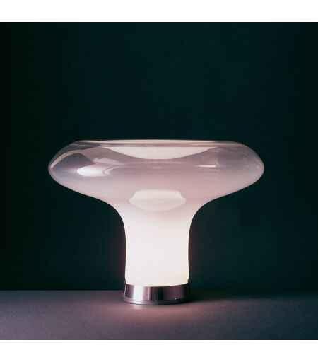 Die exklusive Artemide Lesbo Tischleuchte vom Designer Angelo Mangiarotti in 1967 entworfen und geniest seither einen Kultstatus. Die Eigenschaften des verwendeten Materials spielen bei Mangiarottis Entwürfen eine wesentliche Rolle. Der Baustoff Glas, eine Verbindung zwischen festen und flüssigen Stoffen, lichtdurchlässig und ebenso zerbrechlich wie hart, traditionell wie aktuell, wurde bei der pilzförmigen Artemide Lesbo Tischleuchte auf eindrucksvolle Weise eingesetzt. Der Leuchtenkörper der Artemide Lesbo Tischleuchte besteht aus opalweißem, mundgeblasenem Murano-Glas, der Sockel wird aus Metall gefertigt. Das Licht wird sanft und weich in die Umgebung abgegeben und sorgt für ein harmonisches Zonenlicht, welches insbesondere in einem Wohnzimmer, z. B. auf dem Sideboard oder der Kommode gut zur Geltung kommt. Die Lichtquelle besteht aus einer klassischen E27 Fassung ermöglicht die Verw... ...