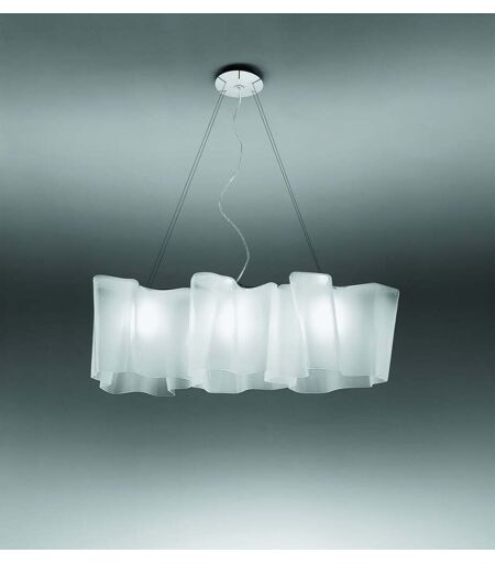 Die Logico 3 in Linea Pendelleuchte von Artemide besitzt eine einzigartige Form aus drei kunstvollen Schirmen. Michele de Lucchi und Gerhard Reichert entwarfen die Logico 3 in Linea für den italienischen Leuchtenhersteller Artemide. Dabei hatten sie die Idee ein Beleuchtungssystem von Grund auf neu zu gestalten. Die Pendelleuchte verteilt direktes und gestreutes Licht. Die Leuchtenschirme der Artemide Logico 3 in Linea bestehen aus mundgeblasenem Glas, welches verschieden verteilte opalfarbige Salze besitzt. Mittels eines Diamantwerkzeuges werden die unteren Ränder der Schirme geschnitten. Die unterschiedlichen Formen der jeweiligen Leuchtenschirme ermöglichen, dass verschiedene Lichtmuster erzeugt werden. Vier Metallseile lassen die Logico 3 in Linea Pendelleuchte schweben. Dank der Seillänge von bis zu ca. 2m, ist die Leuchte auch für hohe Räume geeignet. Drei 150W Leuchtmittel liefern... ...