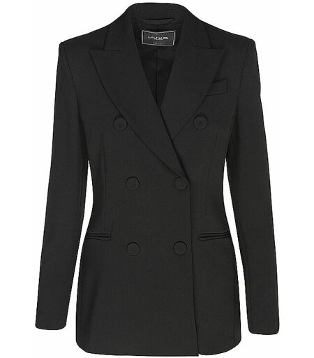 Damen Blazer aus Stretchgewebe Steigendes Revers Paspeltasche auf der Brust Paspeltaschen an den Seiten Geknöpfte Manschetten Zweireihiger Knopfverschluss Innenfutter Unifarben Farbbezeichnung: Nero Material: 95 % Polyester, 5 % Elastan Futter: 68 % Acetat, 32 % Polyester ...