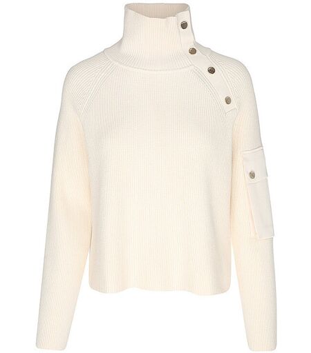 Damen Pullover aus Viskose-Mix mit geripptem Muster Hoher Rollkragen mit Schmuckknöpfen Langarm Tasche aus Nylon mit Patte und Knöpfen am linken Ärmel Gerade Passform Unifarben Farbbezeichnung: Naturale Material: 62% Viskose, 38% Polyester ...