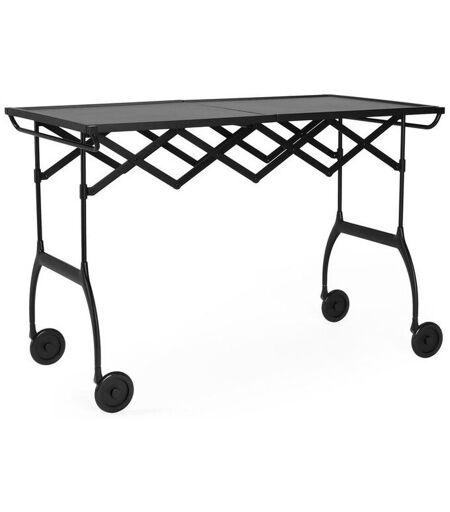 Der Kartell Battista Rollwagen ist ein klappbarer Tisch auf Rollen, der sowohl als Sideboard, Servierwagen als auch zum Arbeiten verwendet werden kann. Der minimalistische Entwurf von von Designer Antonio Citterio ist gezielt auf Flexibilität hin entworfen, denn er ist stets zur Stelle, wenn er gebraucht wird und kann andernfalls platzsparend auf Kleinstmaß zusammengeklappt werden. Der Kartell Battista Rollwagen besteht aus einem Gestell aus Stahl und einem Fuß aus druckgegossenem Aluminium. Das Gestell ist mir einer Ziehharmonika-Funktion versehen und kann so beispielsweise seitlich oder vollständig eingeklappt werden. Die Tischplatte wird aus zwei Teilen in pflegeleichtem Polyurethan gefertigt und ist in verschiedenen Farben erhältlich. Zusammengeklappt ist der Kartell Battista nur 20cm tief und passt so auch in die kleinste Abstellkammer. Ob als Klapptisch in der Küche, für Buffets od... ...