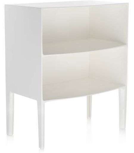 GHOST BUSTER von Kartell ist eine Kommode der besonderen Art. Der Designer Philippe Starck hat hierbei die Kommode neu interpretiert. Sie erinnert in der Form an das klassische Möbelstück, das aber durch das Kunststoffmaterial und die Transparenz aktualisiert wird. Auf der Oberfläche von GHOST BUSTER wechseln sich Winkel und Kurven, gerade und gewundene Linien ab, und schaffen ein faszinierendes Spiel der Perspektiven und Reflexionen, das alle Blicke auf sich zieht. GHOST BUSTER besteht aus drei offenen Regalen auf der Vorderseite und ruht auf vier zweiseitigen Beinen. Es handelt sich um das größte Kunststoffmöbel aus nur einem Stück, das bis heute hergestellt wurde. Dies beweist den Willen von Kartell, erneut die Barrieren der technologischen Herausforderungen zu durchbrechen. GHOST BUSTER von Kartell ist in zwei transparenten (glasklar und fumé) und zwei undurchsichtigen (schwarz und w... ...