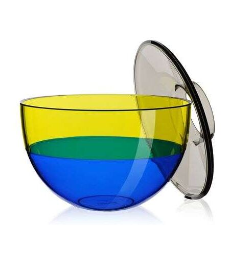 Die Kartell Shibuya Vase bildet ganz selbstverständlich das farbige schillernde Prunkstück eines jeden Tisches. Die klare Formensprache sowie das farbenfrohe, transparente Acrylglas erinnern an Murano-Glas und verhelfen dem Entwurf des Designers Christophe Pillet zu einer besonders wertigen Optik. Die Kartell Shibuya Vase fungiert mit der Öffnung im Deckel in erster Linie als Vase. Da der Deckel aber abnehmbar ist, kann die Vase auch als Schüssel verwendet werden. Das stoßfeste Acryglas ermöglicht hierbei nicht nur eine enorme Robustheit, sondern auch die auffällige Färbung. Trotz der verschiedenfarbigen Streifen wird die Materialoberfläche der Kartell Shibuya Vase nicht unterbrochen und wahrt so die wasserdichte, solide Beschaffenheit. Die gestreifte Optik rückt die Vase ins Zentrum der Aufmerksamkeit und kontrastiert die elegante Form auf interessante Weise. Je nach Untergrund und Lic... ...