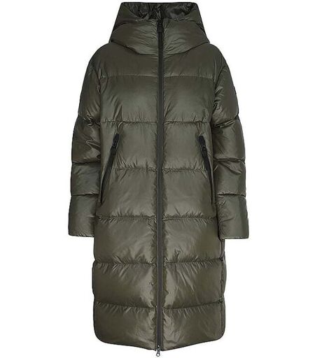 Diese lange, gesteppte Daunenjacke besticht durch ihren raffinierten Glanz und einen modernen, grafischen Look. Gefertigt aus glänzendem Nylon mit außergewöhnlich weichem, fließendem Griff – erzielt durch ein aufwändiges Heißkalandrierungsverfahren – vereint sie Eleganz mit Funktionalität. Die direkte Wattierung mit hochwertigen Naturdaunen sorgt für natürliche, leichte Wärmeisolierung, während das wind- und wasserabweisende Außenmaterial zuverlässigen Schutz bei kaltem und wechselhaftem Wetter bietet. Eine große, abnehmbare Kapuze ergänzt die vielseitige Ausstattung. Kontrastierende Details wie schwarze Reißverschlüsse an den Taschen und am durchgehenden Frontverschluss setzen markante Akzente und verleihen der weichen, funktionellen Silhouette eine klare, grafische Note. Damen Steppmantel aus glänzendem Nylon Abnehmbare Kapuze Schließt mit Zwei-Wege-Reißverschluss Langarm Logo-Patch am linken Ärmel Seitliche Eingrifftaschen mit Reißverschluss Windresistent und wasserabweisend Gerade Passform Unifarben Länge: Ca: 100 cm Farbbezeichnung: Verde Edera Material: 100% Polyamid Futter: 100% Polyamid Füllung: 80% Daunen, 20% Federn - Fill Power 650 ...