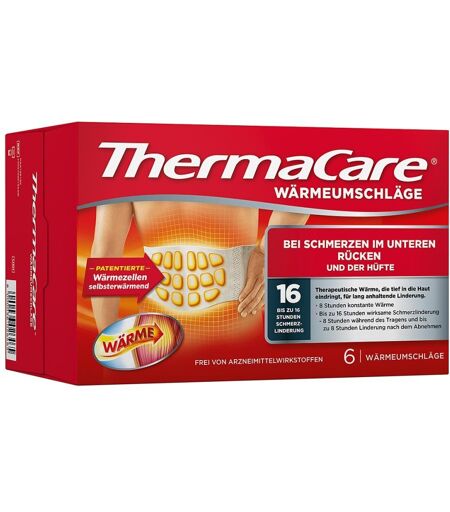 Anwendungsgebiet von ThermaCare bei Schmerzen im unteren Rücken und der HüfteThermaCare bei Schmerzen im unteren Rücken und der Hüfte eignen sich besonders gut zur Behandlung von Verspannungen im unteren Rücken. Die hautfreundlichen Umschläge mit 16 patentierten Wärmezellen sind dank des elastischen Materials und Klettverschlusses stufenlos größenverstellbar.