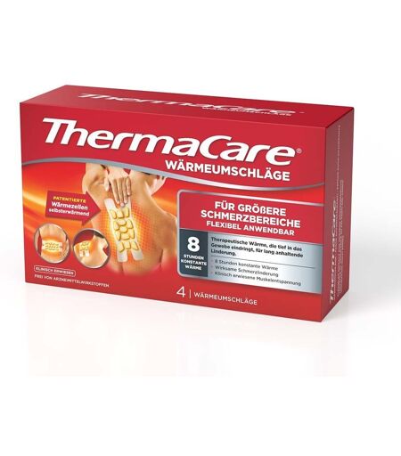 ThermaCare® für größere Schmerzbereiche, Wärmepflaster gegen Rückenschmerzen ThermaCare® Wärmeumschläge für größere Schmerzbereiche eignen sich besonders gut zur Behandlung von großen Schmerzbereichen an Schulter und oberem Rücken. Die hautfreundlichen Auflagen mit 13 patentierten Wärmezellen sind flexibel einsetzbar und werden mit vier Klebepunkten auf der Haut angebracht. 8 Stunden therapeutische Tiefenwärme Effektiv ohne Arzneiwirkstoffe 4 hypoallergene Klebeflächen Flexible Alternative zum Rückengurt Wärmefläche 27,7 x 11,3 cm Diskret auch für unterwegs Schmerzlindernde therapeutische Tiefenwärme entfaltet sich bereits 30min nach dem Öffnen Anwendungsbereiche: Wirksame und gezielte Linderung von Muskel- und / oder Gelenksschmerzen im Zusammenhang mit: Überanstrengung Zerrungen und Verstauchungen Arthritis Muskelverspannungen Geeignet bei akuten, chronischen und gelegentlichen Schmerzen. Für Patienten ab 12 Jahren geeignet, die das Produkt selbstständig anwenden können. Anwendung: Reißen Sie den Beutel unmittelbar vor Gebrauch auf. Schneiden Sie nicht in den Wärmeumschlag. Ziehen Sie das Papier ab, um die Klebeseite freizulegen. Mit der Klebeseite zur Haut über den Schmerzbereich legen. Siehe Abschnitt Nicht verwenden im Hinblick auf Körperstellen, an denen die Wärmeumschläge nicht verwendet werden dürfen. Es kann bis zu 30 Minuten dauern, bis ThermaCare® seine therapeutische Temperatur von 40°C erreicht. Entfernen Sie den Wärmeumschlag nach 12 Stunden. So funktioniert ThermaCare®: ThermaCare® Wärmeumschläge liefern lang anhaltende Wärme bei konstanter Temperatur. Dadurch wird die Blutzirkulation im Gewebe erhöht, was die Schmerzen lindert und die Muskeln entspannt, indem mehr Sauerstoff in geschädigtes Gewebe gebracht und dem Muskel geholfen wird, sich wieder zu erholen; die temperaturempfindlichen Nervenenden stimuliert werden, die Schmerzweiterleitung unterbrochen und somit die Muskelentspannung gefördert wird. ThermaCare® Wärmeumschläge bestehen aus weichem und angenehmem Material mit speziell patentierten Zellen mit Bestandteilen natürlicher Herkunft (Eisen, Aktivkohle, Salz und Wasser), die bei Kontakt mit dem Sauerstoff aus der Luft Wärme entwickeln. Hinweise:Dieses Produkt kann zu Verbrennungen/Blasen führen. Kontrollieren Sie Ihre Haut während der Anwendung regelmäßig. Wenn Sie Hautreizungen oder Verbrennungen feststellen, oder sich das Produkt zu heiß anfühlt, entfernen Sie das Produkt sofort. Für Anwender:innen, die das Produkt nicht selbstständig anwenden können, bzw. für Anwender:innen zwischen 12 und 18 Jahren: Es ist eine Beaufsichtigung durch eine Betreuungsperson erforderlich.Ihr Risiko für Verbrennungen steigt mit zunehmendem... ...