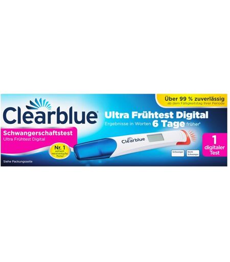 Anwendungsgebiet von Clearblue Schwangerschaftstest Ultra Frühtest DigitalDas Clearblue Schwangerschaftstest Ultra Frühtest Digital Kit kombiniert eine ultrasensitive Früherkennung des Schwangerschaftshormons mit eindeutigen digitalen Ergebnissen in Worten. Der Clearblue Schwangerschaftstest Ultra Frühtest Digital kann bis zu 6 Tage vor dem Ausbleiben der Periode angewendet werden.¹