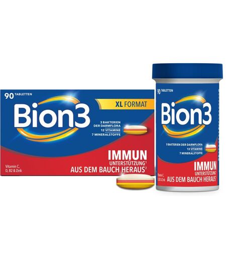 Nahrungsergänzungsmittel sind kein Ersatz für eine ausgewogene und abwechslungsreiche Ernährung und eine gesunde Lebensweise. Unterstütze deine natürlichen Abwehrkräfte mit dem neuen Bion3 Immun – Immun-Unterstützung¹ aus dem Bauch heraus²! Wusstest du, dass ein gesundes Immunsystem im Darm beginnt? Der Darm enthält 70% der körpereigenen Immunzellen und ist das Zentrum der Verdauung, wo essentielle Nährstoffe aufgenommen werden, um dein Immunsystem zu unterstützen. Das neue Bion3 Immun¹ kombiniert Bakterien der Darmflora, Vitamine und Mineralstoffe, die zur Unterstüzung des Darms² und zu einer normalen Funktion des Immunsystems beitragen¹. Jede Tablette enthält 12 Vitamine und 7 Mineralstoffe, inklusive Vitamin C, D und Zink, die zu einer normalen Funktion des Immunsystems beitragen. Vitamin C & Eisen trägt zur Verringerung von Ermüdung bei. Aber das ist noch nicht alles! Bion3 Immun¹ enthält Vitamin B2, Niacin & Biotin zur Unterstützung des Darms², sowie 10 Millionen Bakterien der Darmlora (L. gasseri, B. bifidum, B. Longum), die den Darm lebend erreichen. Für Erwachsene (ab 18 Jahren): Eine Tablette täglich mit einem kalten Getränk zu oder direkt nach einer Mahlzeit einnehmen. ¹ Vitamin C, D und Zink tragen zu einer normalen Funktion desImmunsystems bei. Eisen trägt zur Verringerung von Ermüdung bei. ² Vitamin B2, Niacin & Biotin tragen zur Erhaltung normaler Schleimhäute bei, z.B. im Darm. Der Darm enthält 70% der körpereigenen Immunzellen und ist das Zentrum der Verdauung, wo essentielle Nährstoffe aufgenommen werden, um dein Immunsystem zu unterstützen. Zutaten: Trennmittel: Calciumphosphate; Füllstoff: Cellulose; Ascorbinsäure; Magnesiumoxid; Inulin; DL-alpha-Tocopherylacetat; Überzugsmittel: Hydroxypropylmethylcellulose; Maltodextrin; Dextrose; Trennmittel: Mono- und Diglyceride von Speisefettsäuren; Nicotinamid; Füllstoff: Polyvinylpyrrolidon; Überzugsmittel: Hydroxypropylcellulose; Stärke; Eisensulfat; modifizierte Stärke; Zinkoxid; Füllstoff: Polyvinylpolypyrrolidon; Trennmittel: Magnesiumsalze der Speisefettsäuren; Calcium-Dpantothenat; Füllstoff: vernetzte Natriumcarboxymethylcellulose; Pyridoxinhydrochlorid; Thiaminmononitrat; Riboflavin; Farbstoff: Eisenoxide und Eisenhydroxide; Trennmittel: Siliciumdioxid; Bakterienkulturen (Lactobacillus gasseri PA 16/8, Bifidobacterium bifidum MF 20/5, Bifidobacterium longum SP 07/3)*; Mangansulfat; Retinylacetat; Zucker; Folsäure; DBiotin; Kaliumiodid; mittelkettige Triglyceride (aus Palmöl); Chrom-(III)-chlorid; Natriumselenat; Cholecalciferol; Cyanocobalamin. * Kann Spuren von Milchprotein, Fisch und Soja enthalten Nährwerte:Nährwertangabenpro TabletteReferenzmenge**Vitamin A (RE)800 µg100 %Vitamin D10 µg200 %Vitamin E (α-TE)10 mg83 %Vitamin C120 mg150 %Thiamin (Vitamin B1)1,4 mg127 %Riboflavin (Vitamin B2)1,6 mg114 %Niacin (NE)18 mg113 %Vitamin B62 mg143 %Folsäure300 µg150 %Vitamin B123 µg120 %Biotin150 µg300 %Pantothensäure6 mg100 %Magnesium56,25 mg15... ...