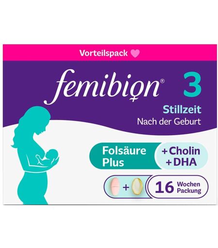 Anwendungsgebiet von Femibion 3 Stillzeit KombipackungFemibion 3 Stillzeit Kombipackung sind ein Nahrungsergänzungsmittel mit Folat (Folsäure und L-Methylfolat), Vitamin A, Eisen, Calcium, der Omega-3-Fettsäure DHA und weiteren Vitaminen und Mineralstoffen.VITAMINE FÜR DIE STILLZEIT NACH DER GEBURT: Mit DHA, Folsäure Plus⁶ (Folsäure & LMethylfolat) & Cholin DHA zur Unterstützung der Gehirnentwicklung des Babys²ZUGESCHNITTENE NÄHRSTOFFE: 400 µg Folat, Tablette enthält, Cholin, L-Methylfolat, Folsäure, Jod,B-Vitamine, Vitamin D, Vitamin E, Zink, Biotin, Niacin, Pantothensäure, Eisen, Calcium und SelenDie Nr. 1 unter den von Gynäkologen empfohlenen Marken*DHA ZUR UNTERSTÜTZUNG DER GEHIRN- UND AUGENENTWICKLUNG²: Kapsel enthält Omega-3 DHA Enthält FischölSowohl Kapsel als auch Tablette sind glutenfrei und laktosefreiAusgewählte Vitamine, Nährstoffe und DHA, aufgeteilt in 1 tägliche Kapsel und 1 tägliche Tablette*Schwangerschaftsvitamine, Mineralstoffe und Nahrungsergänzungsmittel Umfrage in Deutschland von Harris Interactive, Juni 2023. Von Harris Interactive durchgeführte Studie unter 150 Gynäkologen als selbst-verwaltete Online-Interviews zwischen 14. Mai und 26. Juni 2023.¹Vitamin D trägt zu einer normalen Funktion des Immunsystems bei.²Die Einnahme von DHA (mehrfach ungesättigte Omega-3-Fettsäure) durch die Mutter trägt zur normalen Entwicklung des Gehirns und der Augen des Fötus und beim gestillten Säugling bei. Die positive Wirkung von DHA tritt ein, wenn zusätzlich zu der für Erwachsene empfohlenen tägliche Verzehrsmenge an Omega-3-Fettsäuren (d. h. 250 mg DHA und EPA) täglich 200 mg DHA eingenommen werden.³Femibion® ist die einzige Marke in Deutschland mit Folsäure Plus (eine Kombination aus Folsäure und L-Methylfolat) und Cholin.⁴Basierend auf einer internen Analyse von Procter & Gamble unter Verwendung von Daten aus der folgenden Quelle: IQVIA Global OTC Insights, 04A4 M/Vit+Miner Perinatal + 04B4 M ...