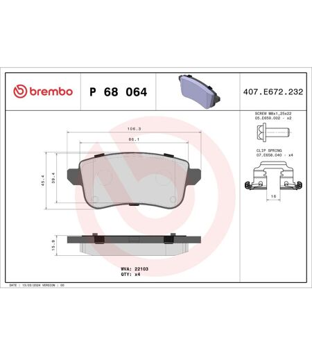 Anzahl der Beläge: 4. Anzahl der federn: 2. Anzahl der schrauben: 2. Breite [mm]: 106. Bremssystem: Lucas. Dicke [mm]: 16. Hersteller: BREMBO. Herstellernummer: P 68 064. Höhe [mm]: 46. Index: P 68 064. Linie: Prime line. Material: Low-Metallic. Montage Achse: Hinten. Produktart: Bremsbelagsatz. Typprüfung: ECE R90 APPROVED. Verschleißkontakt: Nein. WVA-Nummer: 22103. ...