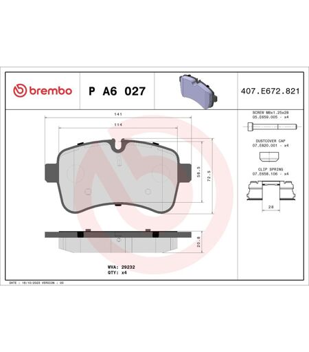 Anzahl der Beläge: 4. Anzahl der schrauben: 4. Anzahl verschleißanzeiger [pro achse]: 2. Breite [mm]: 141. Bremssystem: Brembo. Dicke [mm]: 21. Hersteller: BREMBO. Herstellernummer: P A6 027. Höhe [mm]: 73. Index: P A6 027. Linie: Prime line. Material: Low-Metallic. Montage Achse: Hinten. Produktart: Bremsbelagsatz. Typprüfung: ECE R90 APPROVED. Vorbereitung für Verschleißkontakt: Ja. WVA-Nummer: 29232. ...