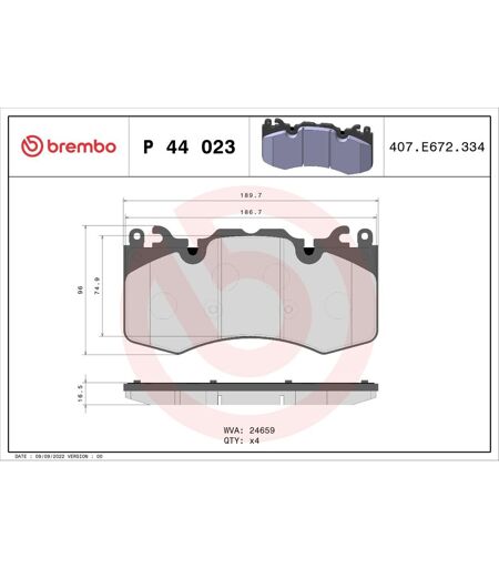 Anzahl der Beläge: 4. Breite [mm]: 190. Bremssystem: Brembo. Dicke [mm]: 17. Hersteller: BREMBO. Herstellernummer: P 44 023. Höhe [mm]: 96. Index: P 44 023. Linie: Prime line. Montage Achse: Vorne. Produktart: Bremsbelagsatz. Typprüfung: ECE R90 APPROVED. Vorbereitung für Verschleißkontakt: Ja. WVA-Nummer: 24659. ...