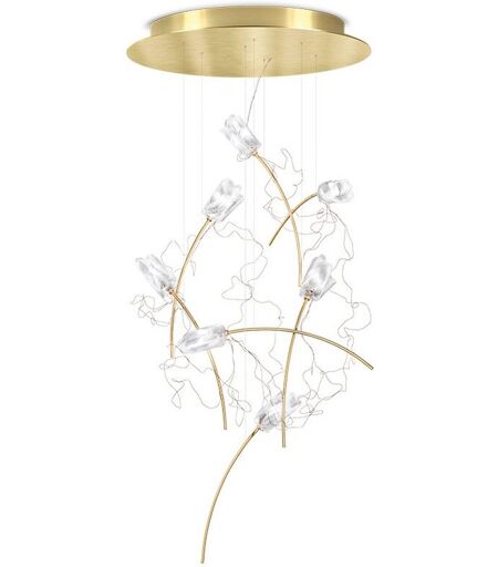 Elegant, leicht, traumhaft - die Slamp Tulip 7 Round Pendelleuchte von Designer Marc Sadler kleidet die Luft buchstäblich mit einer Abfolge von grazilen, leuchtenden Tulpen. Die Blütenkrone aus Lentiflex®, ein unzerbrechlicher, patentierter Kunststoff, wird von Hand im Slamp Atelier gefaltet und geformt und macht jede Blume zu einem Unikat. Der schillernde Effekt des Materials und die zarte Form bringen einen Hauch Eleganz in jeden Raum. Das teilweise unsichtbare Stahlseil hält die leuchtenden Blumen in der Luft, die aus Stängeln aus gebürstetem Messing erblühen. Die Tulpen der Tulip 7 Round sind auf eine bestimmte Weise geneigt sind, um ein natürliches Aussehen nachzubilden. Jede Tulpe ist in Reihe mit der nächsten durch einen verdrehten und suggestiven dünnen Kupferdraht verbunden, in dem Elektrizität mit Niederspannung fließt.