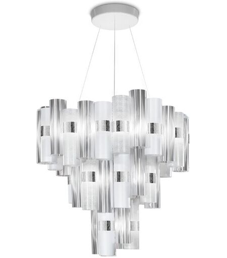 Die Slamp La Lollo Pendelleuchte der italienischen Designerin Lorenza Bozzoli überzeugt durch überragende Eleganz, effektvolle Dramatik und zauberhafte Farb- und Lichteffekte. Das außerordentliche Design ist ein Tribut an die herrlichen 50-er Jahre mit einem System von zylindrischen Aufhängungen in anmutiger Form, die Assoziationen mit dem Glamour und Blitzlichtern der Filmstars und Diven der damaligen Zeit weckt. Die Zylinder aus patentierten Technopolymeren der La Lollo Hängeleuchte werden um einen leuchtenden Ring in der Mitte sind auf unterschiedlichen Höhen angesiedelt und wechseln kaleidoskopartige Farben, Metallisierungen, Spitzenmotive, moderne Farbgradienten und geometrische Muster miteinander ab. Vollkommen im italienischen Slamp Atelier handgefertigt, werden die teiltransparenten Zylinder aus unzerbrechlichen, patentierten Technopolymer mit einem speziellen feinen Textur bedru... ...