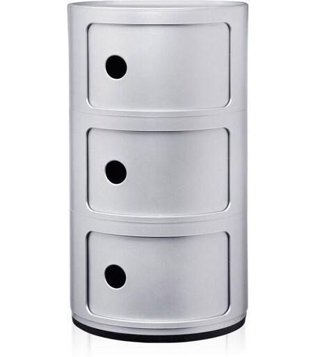 Der Kartell Componibili 3 Elemente Container ist ein schlichter Behälter mit Schiebetüren nach einem Entwurf von Anna Castelli Ferrieri. Das zeitlose Design entstand bereits im Jahr 1969 und ziert seitdem unzählige Flure, Küchen, Wohn- und Arbeitsräume. Als fester Bestandteil der modernen Designgeschichte ist die Kartell Componibili- Kollektion auch Teil der ständigen Ausstellung des Museums of Modern Art und des Centre George Pompidou. Der Kartell Componibili 3 Elemente Container wird aus durchgefärbtem ABS-Kunststoff gefertigt und ist dadurch sowohl stabil als auch pflegeleicht. Die drei Fächer verfügen über eine Schiebetür, die Stauraum für Utensielien und Kleinkram von der Büroklammer bis zum Holzspielzeug. Die verschiedenen Farben des Kartell Componibili 3 Elemente Container setzen gekonnte Akzente oder können passend zum bestehenden Interieur gewählt werden. Im Jahr 2024 w... ...