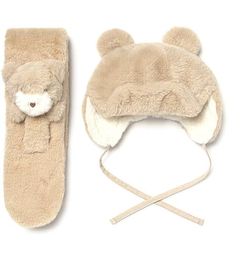 Niedliches Baby Set bestehend aus Mütze und schal Mütze mit Öhrchen und Bindeverschluss Schal mit niedlichem Bär Farbbezeichnung: Beige Material Haube und Schal: 100% Polyester Futter Haube: 57% Baumwolle, 40% Polyester, 3% Elasthan ...