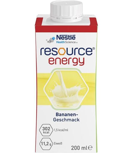 Anwendungsgebiet von Resource Energy BananeResource Energy Banane:Zum Diätmanagement bei bestehender Mangelernährung oder bei Risiko für eine Mangelernährung und/oder:Erhöhtem Energie- und Nährstoffbedarf (z.B. bei konsumierenden Erkrankungen)Flüssigkeitsrestriktion (z.B. bei Herzinsuffizienz)Wirkstoffe / Inhaltsstoffe / ZutatenZutaten von Resource Energy Banane:Wasser, Glukosesirup, Milcheiweiß, pflanzliche Öle (Raps, Mais, Soja), Saccharose, Mineralstoffe (Kaliumchlorid, Magnesiumchlorid, Natriumcitrat, Magnesiumoxid, Eisensulfat, Zinksulfat, Mangansulfat, Kupfersulfat, Natriumfluorid, Chromchlorid, Natriummolybdat, Kaliumiodid, Natriumselenat), Stabilisator (E339), Emulgator (E471), Aroma, Vitamine (C, E, Niacin, Pantothensäure, B6, Thiamin, Riboflavin, A, Folsäure, K, Biotin, D), Verdickungsmittel (E407), Säureregulatoren (E330, E525).resource® energy Bananen-Geschmack100 mlBRENNWERTkJ / kcal637 / 151Fett, davon5,0 g– gesättigte Fettsäuren0,70 g– einfach ungesättigte Fettsäuren1,9 g– mehrfach ungesättigte Fettsäuren2,3 gKohlenhydrate, davon21 g– Zucker5,7 g– LactoseGegenanzeigenBei bekannter Überempfindlichkeit gegenüber einen der oben genannten Inhaltsstoffe sollte dieses Produkt nicht angewendet werden.DosierungVerzehrempfehlung von Resource Energy Banane:Zur ergänzenden Ernährung: 1–3 Flaschen täglich.Zur ausschließlichen Ernährung:Empfehlung des Arztes beachten.InformationNährstoffe von Resource Energy Banane:FETT:Ernährungsphysiologisch hochwertige pflanzliche Öle, wie Raps-, Mais- und Sojaöl.KOHLENHYDRATE:Leicht verdauliche Mischung aus Glucosesirup und Saccharose.EIWEISS:Hochwertiges Milcheiweiß.BALLASTSTOFFE:Ohne Ballaststoffe.HinweiseSchmeckt gekühlt am besten. Ungeöffnet, kühl und trocken lagern. Vor Gebrauch gut schütteln. Geöffnete Flasche wiederverschließen, im Kühlschrank aufbewahren und innerhalb von 24 Stunden verzehren. Umgefüllte Trinknahrung zugedeckt ...