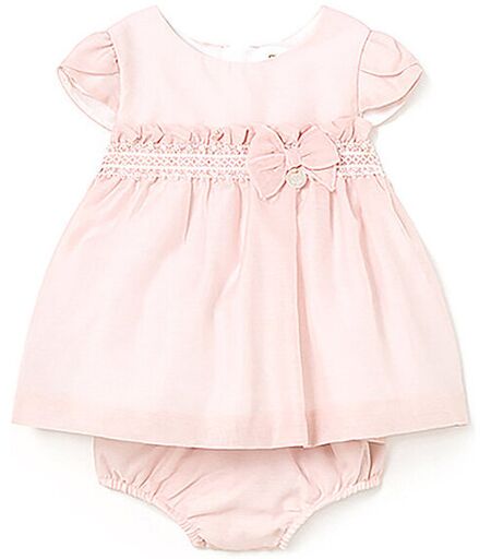 Elegantes Baby Kleid mit Höschen Rundhalsausschnitt Kurzarm Schließt mit Reißverschluss in der hinteren Mitte Spitzen-Borte in der Taille mit Masche In der Taille gerüscht Zusätzliches Höschen mit elastischem Bund Leicht ausgestellt Unifarben Farbbezeichnung: Rosa Material: 100% Polyester Material 2: 85% Baumwolle, 15% Polyamid ...