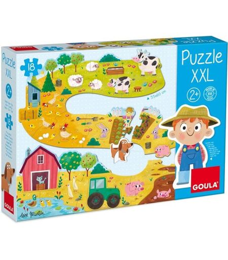 Mit diesem XXL-Puzzle lernt das Kind den Bauernhof kennen. Das Puzzle besteht aus 18 XXL-Teilen, die besonders handlich für Kleinkinder sind. Das Puzzle ist geeignet für Kinder ab 2 Jahren. Zusätzlich sind im lustigen Bauernhof-Puzzle zwei Figuren mit Standfüßen zum Spielen enthalten. Warnhinweis: Achtung: Bitte entfernen sie alle Haltebänder, bevor sie das Spielzeug dem Kind überlassen. Verpackung ist nicht Teil des Spielzeugs. Verpackung mit Herstelleranschrift bitte aufbewahren. Die Inhalte und Farben können gegebenenfalls von der Darstellung auf den Fotos abweichen. Die Marke Goula steht für wunderschöne und altersgerechte Holzpuzzle und -spiele, die die Fantasie der Kleinen anregen sowie insbesondere ihre Feinmotorik und ihr logisches Denken verbessern. Jumbo ist bereits seit 1853 in der Konzeption, Entwicklung und Vermarktung von Spielen und Puzzles aktiv. Seit 1970 agiert das Unternehmen mit dem bekannten roten Elefanten-Logo auf dem deutschen Markt. Die Jumbo Spiele GmbH hat ihren Sitz in Haan. ...