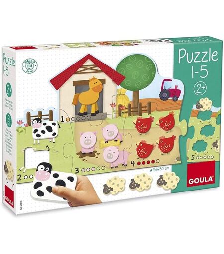 Die Zahlen von 1 bis 5 lernen, indem ein großflächiges Puzzle zusammen gelegt wird und die 15 Holztiere eingefügt werden. Warnhinweis: Achtung: Bitte entfernen sie alle Haltebänder, bevor sie das Spielzeug dem Kind überlassen. Verpackung ist nicht Teil des Spielzeugs. Verpackung mit Herstelleranschrift bitte aufbewahren. Die Inhalte und Farben können gegebenenfalls von der Darstellung auf den Fotos abweichen. Die Marke Goula steht für wunderschöne und altersgerechte Holzpuzzle und -spiele, die die Fantasie der Kleinen anregen sowie insbesondere ihre Feinmotorik und ihr logisches Denken verbessern. Jumbo ist bereits seit 1853 in der Konzeption, Entwicklung und Vermarktung von Spielen und Puzzles aktiv. Seit 1970 agiert das Unternehmen mit dem bekannten roten Elefanten-Logo auf dem deutschen Markt. Die Jumbo Spiele GmbH hat ihren Sitz in Haan. ...