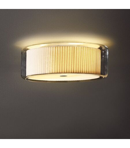 Die Marset Mercer C Deckenleuchte von den Designern Joan Gaspar & Javier M. Borrás besteht aus einem Korpus aus Glas, der durch einen inneren Schirm aus Stoff eine einmalige Lichtwirkung erhält. Die wohnliche Deckenleuchte passt durch ihr ansonsten reduziert gehaltenes Design in jeden Einrichtungsstil. Der gläserne Korpus der Marset Mercer C Deckenleuchte wird auf der Innenseite mit verschiedenen Stoffen ausgekleidet. Die plissierte Naturbaumwolle sorgt für warmes, diffuses Licht, während die Baumwolle in perlweiß das Licht besonders kräftig abgibt. Die Marset Mercer C Deckenleuchte ist zur Entblendung und um den Blick auf das Leuchtmittel dezent zu verhindern, auf der Unterseite mit eine opalen Abdeckscheibe versehen. Die Marset Mercer C Deckenleuchte ist durch die Kombination aus transparentem Glas und dem hellen Stoffschirm aus Baumwolle eine wahrhaft zeitlose Lichtquelle. Du... ...