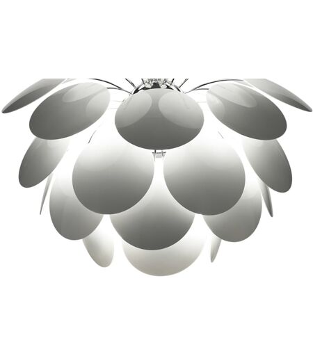 Die Marset Discoco C53 Deckenleuchte bringt einerseits eine wundervolle Lichtatmosphäre mit sich, andererseits eine auffällige Optik, die ihren Platz selbstbewusst ausfüllt. Der Designer Christophe Mathieu schuf durch die versetzten Scheiben, die Discs, ein schillerndes Lichtobjekt in der funktionalen Gestalt einer Deckenleuchte. Die runden Scheiben der Marset Discoco C53 Deckenleuchte werden aus gegossenem ABS hergestellt. Die Deckenleuchte wird in Einzelteilen geliefert, kann durch die sorgfältige Verarbeitung jedoch einfach montiert werden, denn alle Teile lassen sich problemlos zusammenstecken. Sowohl die innen weiß lackierten Scheiben als auch das verchromte Gestell der Marset Discoco C53 Deckenleuchte spiegeln das Licht aus dem Inneren heraus in unterschiedlicher Intensität und ermöglicht so ein immer im Wechsel befindliches Lichtschauspiel, das durch das direkt nach unten abgegebe... ...
