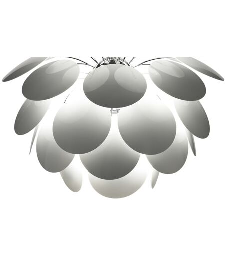 Die Marset Discoco C68 Deckenleuchte bringt einerseits eine wundervolle Lichtatmosphäre mit sich, andererseits eine auffällige Optik, die ihren Platz selbstbewusst ausfüllt. Der Designer Christophe Mathieu schuf durch die versetzten Scheiben, die Discs, ein schillerndes Lichtobjekt in der funktionalen Gestalt einer Deckenleuchte. Die runden Scheiben der Marset Discoco C68 Deckenleuchte werden aus gegossenem ABS hergestellt. Die Deckenleuchte wird in Einzelteilen geliefert, kann durch die sorgfältige Verarbeitung jedoch einfach montiert werden, denn alle Teile lassen sich problemlos zusammenstecken. Sowohl die innen weiß lackierten Scheiben als auch das verchromte Gestell der Marset Discoco C68 Deckenleuchte spiegeln das Licht aus dem Inneren heraus in unterschiedlicher Intensität und ermöglicht so ein immer im Wechsel befindliches Lichtschauspiel, das durch das direkt nach unten abgegebe... ...