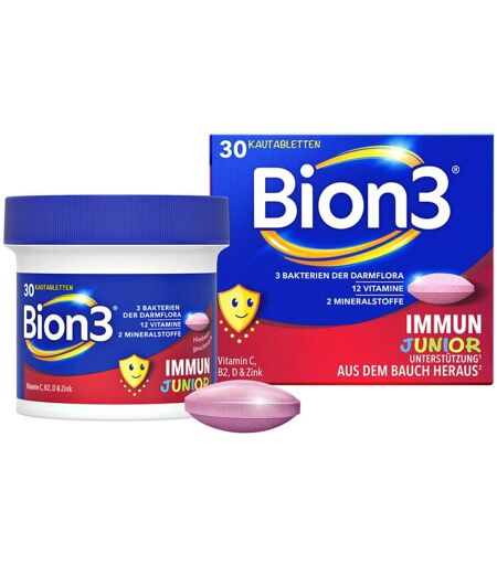 Das Bion3® IMMUN¹ Junior wurde speziell mit einer einzigartigen Kombination aus Vitaminen und Mineralstoffen entwickelt, die den Darm unterstützen² und die natürlichen Abwehrkräfte erhält¹ und mit Bakterienkulturen.