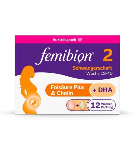 Nahrungsergänzungsmittel sind kein Ersatz für eine abwechslungsreiche und ausgewogene Ernährung und eine gesunde Lebensweise.Femibion® 2 Schwangerschaft SCHWANGERSCHAFTSVITAMINE für das 2. und 3. Trimester: Mit Cholin, DHA, Folsäure Plus (Folsäure & L-Methylfolat)³ zur Erhöhung des Folatspiegels; DHA zur Unterstützung der Gehirnentwicklung von Babys² ZUGESCHNITTENE NÄHRSTOFFKOMBINATION: 400 μg Folat, Tablette enthält Omega 3 DHA, Cholin, L-Methylfolat, Folsäure, Jod, B-Vitamine, Vitamin D, Vitamin E, Zink, Biotin, Niacin, Pantothensäure und Selen Entwickelt für dich¹ und die gesunde Entwicklung deines Babys² DHA ZUR UNTERSTÜTZUNG DER GEHIRN- UND AUGENENTWICKLUNG²: Kapsel enthält Omega-3 DHA; Enthält Fischöl Sowohl Kapsel als auch Tablette sind glutenfrei und laktosefrei ¹Vitamin D trägt zu einer normalen Funktion des Immunsystems bei ²Die Einnahme von DHA (mehrfach ungesättigte Omega-3-Fettsäure) durch die Mutter trägt zur normalen Entwicklung des Gehirns und der Augen des Fötus und beim gestillten Säugling bei. Die positive Wirkung von DHA tritt ein, wenn zusätzlich zu der für Erwachsene empfohlenen tägliche Verzehrsmenge an Omega-3-Fettsäuren (d. h. 250 mg DHA und EPA) täglich 200 mg DHA eingenommen werden. ³Folsäure Plus ist eine Kombination aus Folsäure und L-Methylfolat. L-Methylfolat ist eine Form von Folat, die direkt vom Körper verwendet werden kann. Folat wird vom Körper auch nach dem 1. Trimester benötigt, z. B. als Beitrag zum Wachstum des mütterlichen Gewebes (z. B. der Plazenta). ⁴Basierend auf einer internen Analyse von Procter & Gamble unter Verwendung von Daten aus der folgenden Quelle: IQVIA Global OTC Insights, 04A4 M/Vit+Miner Perinatal + 04B4 M/Vit W/O Miner Perinatal*; CE/W Europa (27 Länder) Umsatzvolumen nach Marken für den MAT Juni 2023 unter Berücksichtigung von Schätzungen der realen Aktivität. Copyright IQVIA. Alle Rechte vorbehalten. ⁶Femibion® ist die einzige Marke in Deutschland mit Folsäure Plus (eine Kombination aus Folsäure und L-Methylfolat) und Cholin. Zutaten: (Tablette): Füllstoff: Mikrokristalline Cellulose, Magnesiumoxid, Calcium-L-ascorbat (Vitamin C), Eisenbisglycinat, Überzugsmittel: Hydroxypropylmethylcellulose, Farbstoff: Calciumcarbonat, Maltodextrin, Nicotinamid (Niacin), Füllstoff: Vernetzte Carboxymethylcellulose, Säuerungsmittel: Citronensäure, Überzugsmittel: Polyvinylalkohol, Polyethylenglycol, Hydroxypropylcellulose, Talkum; Zinkoxid, DL-α-Tocopherylacetat (Vitamin E), Calcium-D-pantothenat (Pantothensäure), Trennmittel: Magnesiumsalze der Speisefettsäuren, Speisefettsäuren, Calciumphosphate; Zucker, Modifizierte Stärke, Pyridoxinhydrochlorid (Vitamin B6), Thiaminmononitrat (Vitamin B1), Stärke, Riboflavin (Vitamin B2), Calcium-L-methylfolat (Metafolin®), Pteroylmonoglutaminsäure (Folsäure), Kaliumiodid, Natriumselenat, D-Biotin, Cholecalciferol (Vitamin D), Cyanocobalamin (Vitamin B12). (Kapsel): DHA-haltiges Fischöl-Konzentrat, Gelatine (Rind), raffiniertes Sonnenblumenöl,... ...