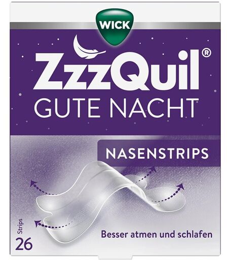 Anwendungsgebiet von Wick Zzzquil Gute Nacht NasenstripsDie WICK ZzzQuil® Gute Nacht Nasenstrips, ein innovatives Medizinprodukt, erleichtern die Atmung und fördern erholsamen Schlaf*.Sanfte 4-Punkte-Technologie: Die konturierte Form sorgt dafür, dass die Strips die ganze Nacht über zuverlässig haften.Freieres Atmen: Öffnet die Nasengänge sofort und unterstützt eine ungehinderte Atmung während der Nacht.Sanft zur Haut: Hypoallergen und dermatologisch getestet, ideal für empfindliche Haut.Einfach zu verwenden: Geruchsneutral, frei von Duftstoffen und mühelos zu entfernen.Die WICK ZzzQuil® Gute Nacht Nasenstrips wurden entwickelt, um die Nasenatmung zu verbessern und Schnarchen zu reduzieren. Sie fördern eine sofortige Öffnung der Nase und erleichtern das Atmen* über die gesamte Nacht hinweg.Geeignet für Erwachsene und Kinder ab 5 Jahren.Komfortables Tragegefühl die ganze Nacht.Ideal bei NasenverstopfungDie Nasenstrips helfen unmittelbar, die Nase sanft zu öffnen und die Atmung zu verbessern*.Für optimale Nachtruhe kombinieren:Ergänzen Sie die Nasenstrips mit den WICK ZzzQuil® Gute Nacht Weichgummis oder den WICK ZzzQuil® Gute Nacht Ein¹- und Durchschlafen² Tabletten für ein rundum erholsames Schlaferlebnis.*Befreit sofort eine verstopfte Nase und verbessert: Atmung, Schnarchen und Schlaf ¹ Melatonin, trägt dazu bei, die Einschlafzeit zu verkürzen. Der gewünschte Effekt wird durch die Einnahme von 1 mg Melatonin kurz vor dem Schlafen- gehen erzielt. ² Mit pflanzlichen Inhaltsstoffen: 160 mg Baldrianextrakt und 80 mg Zitronenmelissenextrakt, die beim Einund Durchschlafen helfen.GegenanzeigenBei bekannter Überempfindlichkeit sollte dieses Produkt nicht angewendet werden.DosierungAnwendungsempfehlung von Wick Zzzquil Gute Nacht Nasenstrips:1. Reinigen & SäubernWaschen Sie Ihre Nase gründlich mit Seife und Wasser.Trocknen: Achten Sie darauf, die Nase vollständig zu trocknen.Entfernen Sie Make-up, Creme, Öl oder sonstige Rü ...