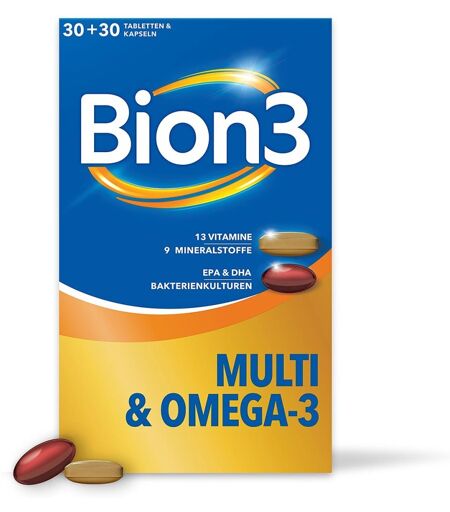 Anwendungsgebiet von Bion3 Multi+Omega-3 KombipackungBion3 Multi & Omega-3 mit Bakterienkulturen!Wussten Sie, dass Bion3 Multi & Omega-3 mit Bakterienkulturen unsere umfassendste Formulierung zur Unterstützung Ihres Wohlbefindens ist?Bion3 Multi & Omega-3 ist ein Nahrungsergänzungsmittel für Erwachsene und besteht aus einer Kombination aus Nährstoffen wie Vitamin C und Magnesium zur Unterstützung Ihrer mentalen und körperlichen Energie⁵. Zusätzlich enthält jede Kapsel EPA & DHA zur Unterstützung von Herz¹, Gehirn² und Sehkraft³ sowie Bakterienkulturen.Jede Multivitamin-Tablette enthält eine Kombination aus 13 Vitaminen und 9 Mineralstoffen zur Unterstützung Ihrer mentalen und körperlichen Energie⁵.Die Kapseln sind mit Omega-3-Fettsäuren, insbesondere DHA und EPA, gefüllt – wichtige Nährstoffe zur Unterstützung von Herz¹, Gehirn² und Sehkraft³.Darüber hinaus enthalten die Bion3 Multi+Omega-3 Kombipackung 1.000 Millionen Bakterienkulturen (Bacillus subtilis DE111), die Ihren Darm lebend erreichen.¹ EPA und DHA tragen zu einer normalen Herzfunktion bei. Die positive Wirkung für das Herz stellt sich bei einer täglichen Aufnahme von 250 mg EPA und DHA ein.² DHA trägt zur Erhaltung einer normalen Gehirnfunktion bei. Die positive Wirkung für Gehirn und Sehkraft stellt sich bei einer täglichen Aufnahme von 250 mg DHA ein.³ DHA trägt zur Erhaltung einer normalen Sehkraft bei. Die positive Wirkung für Gehirn und Sehkraft stellt sich bei einer täglichen Aufnahme von 250 mg DHA ein.⁴ Mit Bakterienkulturen, die den Darm lebend erreichen.⁵ Vitamin B12, C, Eisen & Magnesium tragen zu einem normalen Energiestoffwechsel und zur Verringerung von Ermüdung bei.⁶ Vitamin C, D und Zink tragen zu einer normalen Funktion des Immunsystems bei.⁷ Vitamin B12, C, Eisen & Magnesium tragen zu einem normalen Energiestoffwechsel und zur Verringerung von Ermüdung bei. Die Vitamine B1, B3, B6, B7, B12, Folsäure und Magnesium tragen zu einer n ...