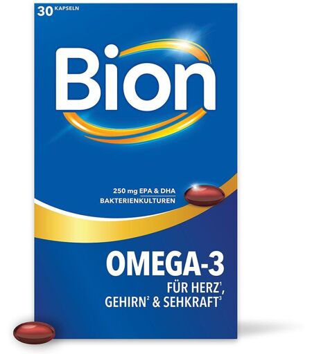 Anwendungsgebiet von Bion Omega-3 KapselnBion Omega-3 mit Bakterienkulturen!Wussten Sie, dass Omega-3-Fettsäuren eine wichtige Rolle in der Ernährung spielen? Probieren Sie die neuen Bion Omega-3 Kapseln zur Unterstützung von Herz¹, Gehirn² und Sehkraft³.Die Bion Omega-3 Kapseln enthalten EPA und DHA zur Unterstützung von Herz¹, Gehirn² und Sehkraft³ – ergänzt durch Bakterienkulturen.Jede Kapsel ist reich an Omega-3-Fettsäuren, insbesondere DHA und EPA, die wichtige Nährstoffe zur Unterstützung von Herz¹, Gehirn² und Sehkraft³ sind.Darüber hinaus enthalten die Bion Omega-3 Kapseln 1.000 Millionen Bakterienkulturen (Bacillus subtilis DE111), die Ihren Darm lebend erreichen.¹ EPA und DHA tragen zu einer normalen Herzfunktion bei. Die positive Wirkung für das Herz stellt sich bei einer täglichen Aufnahme von 250 mg EPA und DHA ein.² DHA trägt zur Erhaltung einer normalen Gehirnfunktion bei. Die positive Wirkung für Gehirn und Sehkraft stellt sich bei einer täglichen Aufnahme von 250 mg DHA ein.³ DHA trägt zur Erhaltung einer normalen Sehkraft bei. Die positive Wirkung für Gehirn und Sehkraft stellt sich bei einer täglichen Aufnahme von 250 mg DHA ein.⁴ Mit Bakterienkulturen, die den Darm lebend erreichen. Der Darm ist das Zentrum der Verdauung, wo wichtige Nährstoffe aufgenommen werden.Wirkstoffe / Inhaltsstoffe / ZutatenBion Omega-3 Kapseln enthält:Zutaten: Fischöl Gelatine Festigungsmittel: Glycerin Verdickungsmittel: Mono- undDiglyceride von Speisefettsäuren DE111® Bacillus subtilis Vitamin E (DL-αTocopherylacetat) Emulgator: Sonnenblumenlecithin Dextrin Farbstoff: Eisenoxide und -hydroxide Sonnenblumenöl Vitamin D (Cholecalciferol).InhaltsstoffPro Kapsel% Referenzmenge*Fischöl TG (Triglyceride)417 mg-davon Omega-3292 mg-davon EPA167 mg-davon DHA83 mg-Bacillus Subtilis DE111®1 × 10⁹ KBE**-Vitamin D8 µg160 %Vitamin E (α-TE)6 mg50 %* % der Referenzmenge gemäß Verordnung (EU) Nr. 1169/2011**KBE: Kolonieb ...