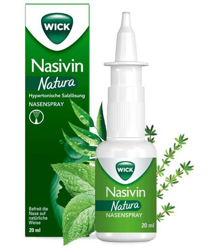 Anwendungsgebiet von Wick Nasivin Natura NasensprayWick Nasivin Natura Nasenspray - Hilft, verstopfte Nasen aufgrund von Erkältung oder allergischem Schnupfen zu befreienWick Nasivin Natura Nasenspray ist ein abschwellendes Nasenspray, ist eine hypertonische Salzlösung, die hilft, verstopfte Nasen aufgrund von Erkältung oder allergischem Schnupfen auf natürliche Weise* zu befreien. Außerdem trägt das Nasenspray dazu bei, Viren, Bakterien, Allergene und Verschmutzungen, die über die Luft aufgenommen wurden, zu entfernen. Die Formulierung von Nasivin® Natura befreit die Nase, befeuchtet, pflegt und erfrischt! Nasivin® Natura enthält: Hypertonische Salzlösung bei verstopfter Nase. ProVitamin B5 befeuchtet die Nasenschleimhaut. Menthol-, Eukalyptus- und Thymianöl natürlichen Ursprungs. 97 % der Inhaltsstoffe sind natürlichen Ursprungs.