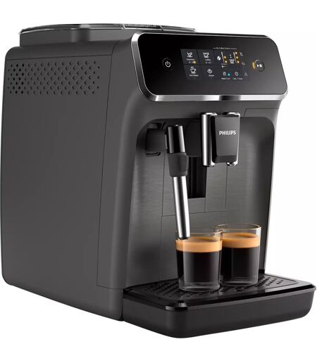 Mit dem Philips EP2224/10 Kaffeevollautomat der Series 2200 ist der Lieblings-Kaffee nur einen Knopfdruck entfernt. Durch das integrierte Keramik-Scheibenmahlwerk genießt man immer frisch gemahlenen Kaffee. Die intuitive SensorTouch Oberfläche der EP2224/10 macht die Zubereitung zum Kinderspiel. Für Genießer von Kaffee-Milch-Spezialitäten ist ein klassischer Milchaufschäumer integriert worden. So bereitet man beispielsweise köstlichen Cappuccino auf traditionelle Art und Weise zu. Über das Menü "Meine Kaffeeauswahl" passt man Stärke und Menge des Getränks der eigenen Vorlieben an. Dank des schnell aufheizenden Durchlauferhitzers kann heißer Kaffee in kürzester Zeit genossen werden. Die Reinigung des EP2224/10 Kaffeevollautomaten gestaltet sich dank automatischer Reinigungsfunktion relativ einfach. Der klassische Milchaufschäumer ist mit nur zwei Teilen leicht zu reinigen. Zusätzlich lässt sich die Brühgruppe einfach entnehmen und unter fließendem Wasser abspülen. ...