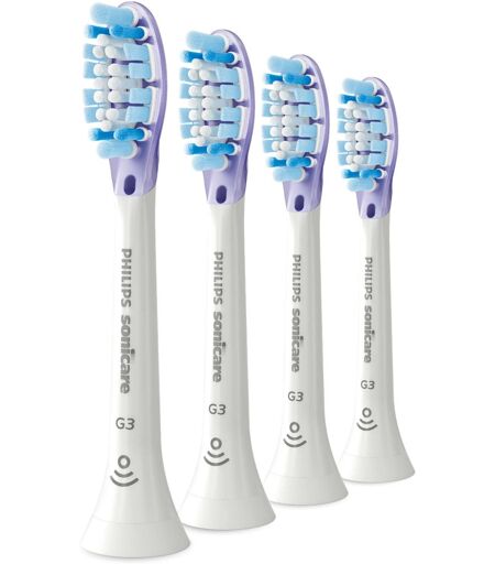 Die Aufsteckbürsten Philips Sonicare HX9054/17 G3 Premium Gum Care im 4er-Pack mit speziellem Bürstenkopfdesign und Schalltechnologie ermöglichen eine gründliche und sanfte Reinigung. Die Borsten entfernen effektiv Plaque und Bakterien am Zahnfleischrand und an schwer zugänglichen Stellen. Sie entfernen bis zu 10 mal mehr Plaque als eine gewöhnliche Handzahnbürste. Die weichen, flexiblen Seiten aus Gummi absorbieren dabei übermäßigen Druck. Das weiche Gewebe um das Zahnfleisch wird geschont, selbst wenn man zu stark bürstet. Die Aufsteckbürsten HX9054/17 eignen sich für alle Sonicare Modelle (außer PowerUp Battery und Essence). ...