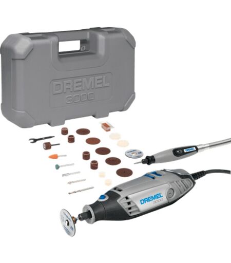Das Dremel-Set 3000-1/25 enthält das beliebte leistungsstarke Allround-Multifunktionswerkzeug Dremel 3000 mit EZ Twist Anschlusskappe. Der handliche Schleifer eignet sich perfekt für Heimwerkerprojekte, die eine leistungsfähige, präzise Oberflächenbearbeitung auf verschiedenen Materialien erfordern. Mit den 25 enthaltenen Zubehören wechselt man in kürzester Zeit zwischen den unterschiedlichsten Anwendung: Vom Schnitzen, Gravieren, Schleifen, Reinigen, Polieren bis zum Schneiden und mehr. Zusammen mit der biegsamen Welle für präzise detailgetreue Arbeiten oder schwer zugängliche Stellen verhilft dieses Set mühelos zu sauberen Ergebnissen. Durch die variablen Geschwindigkeitseinstellungen und die große Auswahl an enthaltenem Zubehör kann das Gerät auf vielen verschiedenen Materialien verwendet werden. Der Dremel 3000 kann mit allen Zubehören für Dremel Multifunktionswerkzeuge und den meisten Vorsatzgeräten verwendet werden. Das Set wird mit einem Werkzeughalter geliefert, mit dem das Gerät an der Wand angebracht und das Kabel komfortabel aufgewickelt werden kann. ...