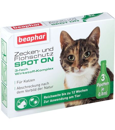 Beaphar Zecken- und Flohschutz SPOT -ON ist für Katzen ab 12 Wochen geeignet und bietet einen effektiven Schutz vor Lästlingen. Die Kombination der Wirkstoffe hält Zecken und Flöhe fern und hat überdies fellpflegende Eigenschaften. Durch das SPOT ON Präparat wird ein frischer und hygienischer Effekt erreicht. Abschreckung nach dem Vorbild der Natur: Gegen Zecken und Flöhe Prophylaktische Eigenschaften Sofortschutz direkt nach dem Auftragen Für Katzen ab 12 Wochen Anwendung1 Pipette (= 0,8 ml) pro Katze. Anwendung alle 28 Tage wiederholen. Falls Ihre Katze sehr nass geworden ist, empfehlen wir eine Wiederholung der Anwendung nach mind. 7 Tagen Wartezeit zum ersten Gebrauch. Der Pipetteninhalt wird im Nacken der Katze aufgetragen, so dass die Tropfen nicht aufgeleckt werden können. Seine volle Wirkung entfaltet das SPOT-ON Präparat sofort nach dem Auftragen. Hinweis:Biozidprodukte vorsichtig verwenden. Vor Gebrauch stets Etikett und Produktinformationen lesen. ...