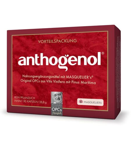Nahrungsergänzungsmittel sind kein Ersatz für eine abwechslungsreiche und ausgewogene Ernährung und eine gesunde Lebensweise.ANTHOGENOL® kann zu den Mahlzeiten eingenommen werden. Es empfiehlt sich jedoch, ANTHOGENOL® auf nüchternen Magen oder zwischen den Mahlzeiten zusammen mit einem Glas Fruchtsaft oder Wasser einzunehmen. Nehmen Sie ANTHOGENOL® möglichst nicht zugleich mit proteinreichen Nahrungsmitteln wie Milch ein. Achten Sie darauf, über den Tag verteilt ausreichend Wasser zu trinken.Zutaten:Mikrokristalline Cellulose (Füllstoff), Hydroxypropylmethylcellulose (Kapsel), Einfache und Oligomere Flavanole & Polyphenole aus Vitis Vinifera Kernen; französisches Pinus Maritima Cortex Extrakt.ANTHOGENOL® ist für Vegetarier geeignet.Nährwerte: Zusammensetzung pro 2 Kapseln pro 4 Kapseln Masquelier's® Original OPCs 75 mg 150 mg Masquelier's® French Pine Bark Extract 25 mg 50 mg Verzehrempfehlung: Es wird empfohlen eine Erhaltungsdosis von 2 ANTHOGENOL® Kapseln täglich, es können jedoch 2 bis 4 Kapseln täglich eingenommen werden. Hinweis:Die angegebene empfohlene Tagesmenge darf nicht überschritten werden.Aufbewahrung: Kühl (6-25 °C) und lichtgeschützt lagern. Außerhalb der Reichweite von kleinen Kindern aufbewahren.Nettofüllmenge: 90 Kapseln = 28,8 g Hersteller: I.N.C. Agency BV De Zodde 161231 MB Loosdrecht, Niederlande ...