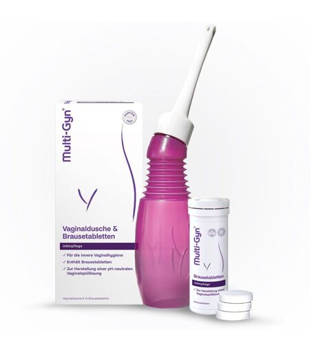 Spült effizient und schonend Die Multi-Gyn Vaginaldusche bietet höchsten Komfort und funktioniert in jeder Position, die für Sie angenehm ist. Unser Tipp: Wenden Sie die Multi-Gyn Vaginaldusche am besten über einer Badewanne, Dusche oder Toilette an, damit die Flüssigkeit leicht abfließen kann. Und nur damit Sie es wissen: Mit den Multi-Gyn Brausetabletten stellen Sie eine natürliche und milde Spüllösung her. Integriertes Spezialventil Die Multi-Gyn Vaginaldusche ist mit einem Spezialventil ausgestattet, dass das Zurückfließen der Spüllösung und einen zu starken Druck in der Scheide verhindert. Ergonomisches Design zur Anwendung in beliebiger Position Die Multi-Gyn Vaginaldusche bietet höchsten Komfort und funktioniert in jeder Position, die für Sie angenehm ist. Weiche Flasche, die sich leicht zusammendrücken lässt Der weiche und biegsame Applikator in Kombination mit dem flexiblen Flaschenwinkel ermöglicht eine bequeme Anwendung. Dank des speziellen Silikonventils schützt die Vaginaldusche vor Überdruck oder Rückfluss der Lösung. Milde Spüllosung Mit den Multi-Gyn Brausetabletten stellen Sie eine natürliche und milde Spüllösung her. Die Anwendung der Multi-Gyn® Vaginaldusche 1. Füllen Sie die Multi-Gyn Vaginaldusche bis zum oberen Rand des gerippten Endes mit lauwarmem Wasser. 2. Teilen Sie eine Multi-Gyn Brausetablette in zwei Hälften und lösen Sie beide für die Spüllösung auf. 3. Schrauben Sie den Applikator auf die Flasche, sobald die Tablette nicht mehr sprudelt. 4. Führen Sie den Applikator vorsichtig in die Scheide ein. 5. Drücken Sie die Flasche sanft, um Ihre Vagina mit der Intimdusche zu reinigen. 6. Spülen Sie die Multi-Gyn Vaginaldusche und den Applikator nach Gebrauch mit sauberem, warmem Wasser aus und lassen Sie alle Bestandteile an der Luft trocknen. Hinweise für die Anwendung der Multi-Gyn® Vaginaldusche Spülen Sie die Multi-Gyn Vaginaldusche niemals mit heißem bzw. kochendem Wasser aus, da sie sich sonst verformen könnte. Möchten Sie schwanger werden, sollten Sie von einer Anwendung der Intim-Pflege bis drei Tage nach dem Geschlechtsverkehr absehen. Die Multi-Gyn Vaginaldusche eignet sich nicht als Verhütungsmittel. Wenn nicht anders vom Arzt verordnet, empfiehlt es sich, eine Vaginaldusche nicht häufiger als drei Mal pro Woche anzuwenden. ...